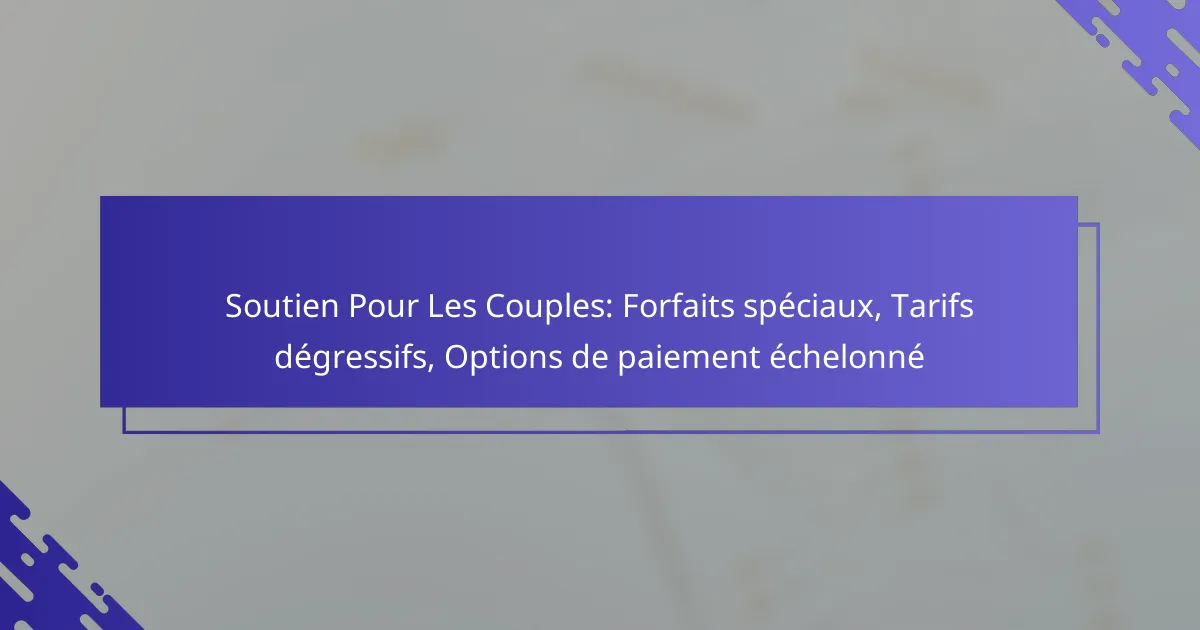 Les forfaits spéciaux pour les couples sont des offres tarifaires conçues pour faciliter l’accès à des services destinés aux couples, souvent à des prix réduits. Ces forfaits peuvent inclure des séances de thérapie, des ateliers ou des retraites, permettant aux couples de renforcer leur relation tout en bénéficiant d’avantages financiers.